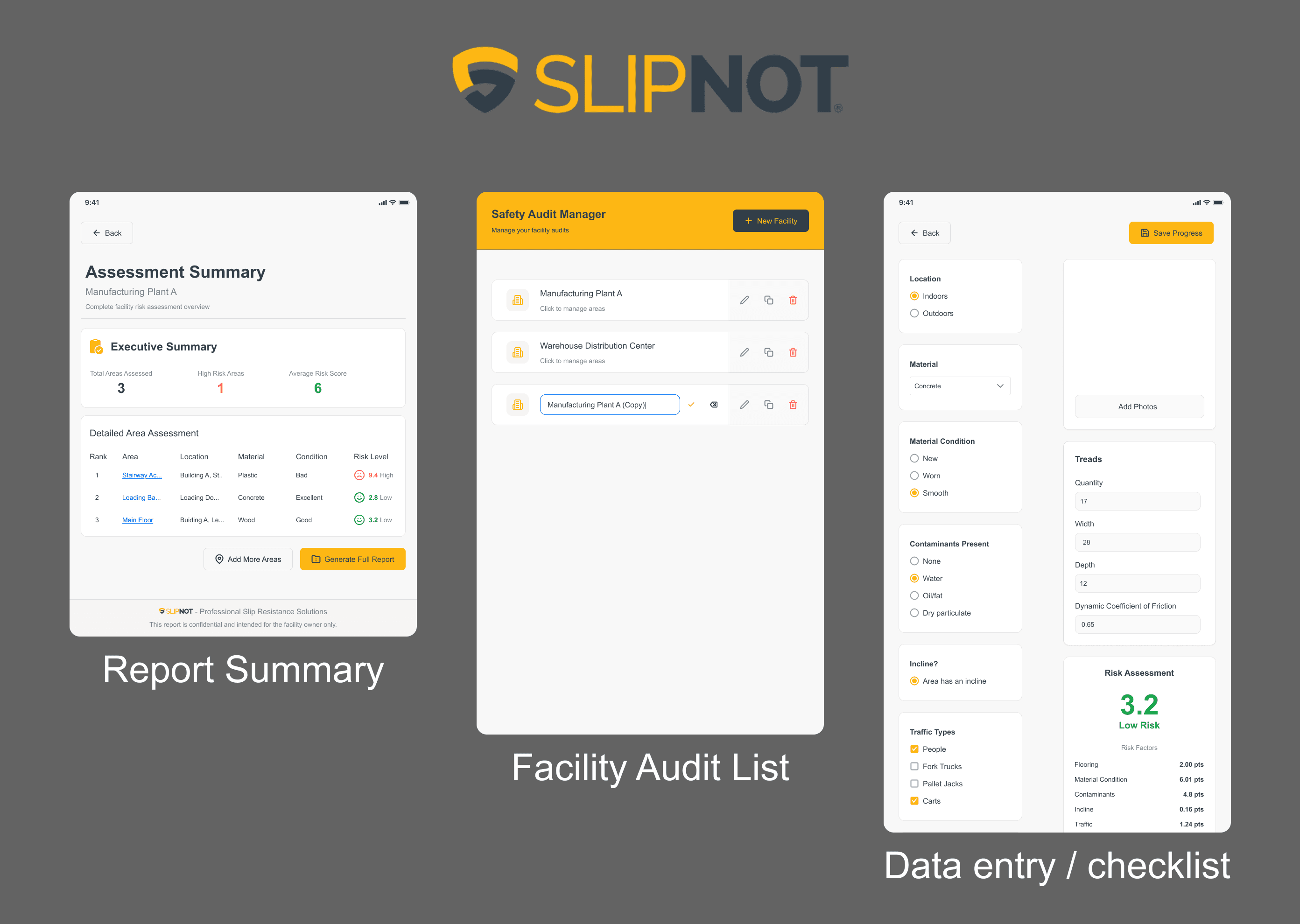 Slipnot is an enterprise iPad application used by field teams to conduct safety audits in industrial and commercial environments. I designed the audit experience and visual system to support fast data entry, accurate risk assessment, and consistent reporting in real-world conditions.